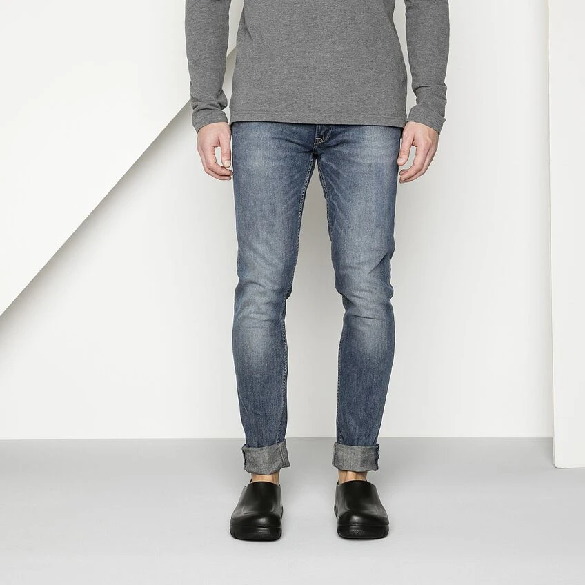 The A 640 PU clog covers all bases when it comes to stringent hygiene standards and reliable nonslip properties. Its enclosed design and the nonslip treaded sole offer reliable grip and maximum sure-footedness in kitchens and the food industry. Its solid steel toe cap protects toes and the front of the foot from impacts of up to 200 joules. Its oil- and grease-resistant material is also water-resistant, allowing it to be cleaned efficiently and thoroughly. This involves removing the cork-latex footbed and washing the clog at up to 80° Celsius. Both parts of the shoe are suitable for daily disinfection. The anatomically shaped original BIRKENSTOCK footbed protects joints and tendons, and is also washable at up to 30° Celsius. The footbed is available separately and can therefore be replaced if necessary. The A 640 model is certified in accordance with EN ISO 20345:2011 SB E (SRC category).